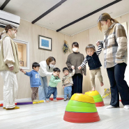 - 音楽とともに、ボール、フープ、マット、ロープなどを使い、身体のバランス感覚を養います。